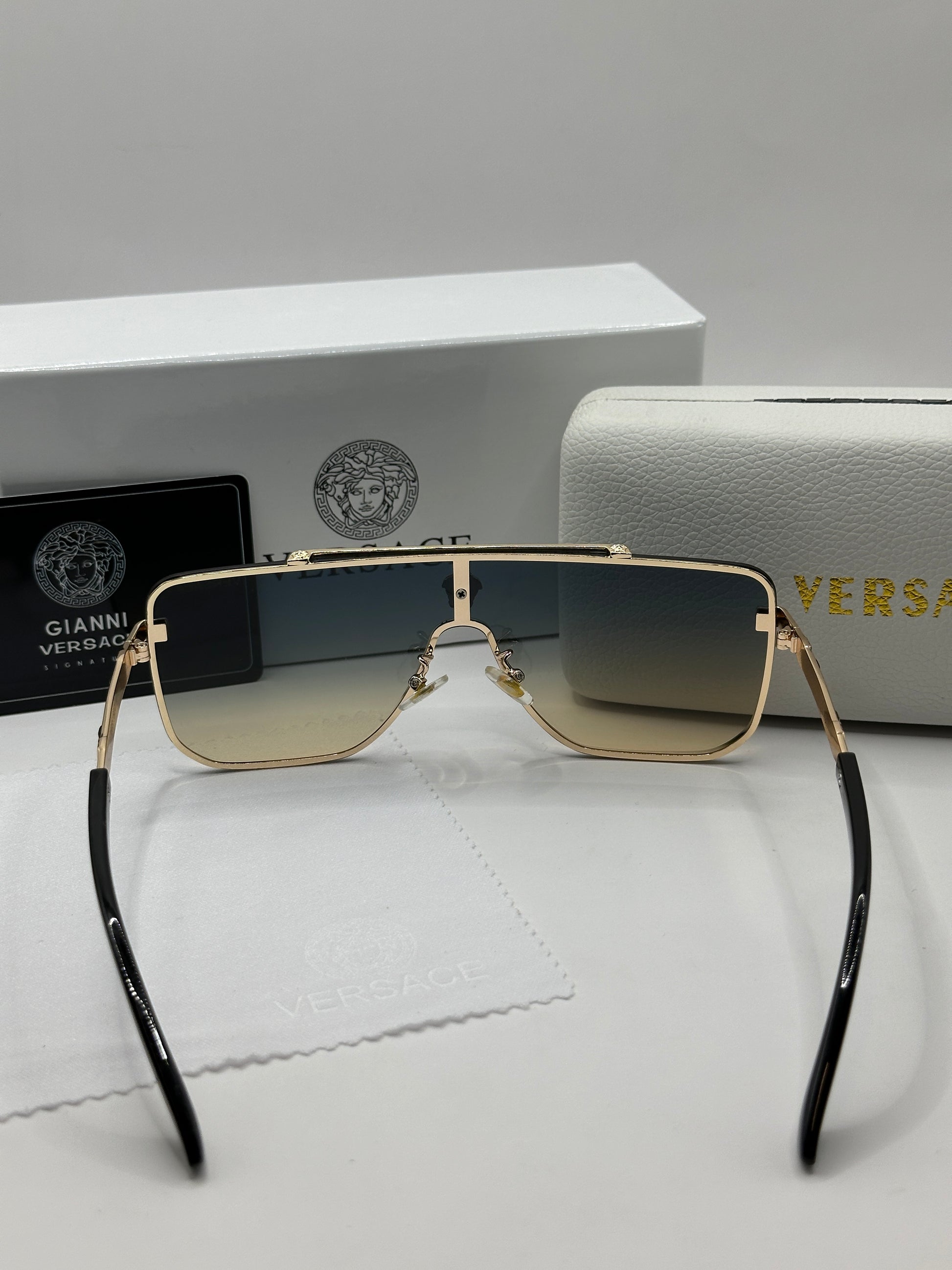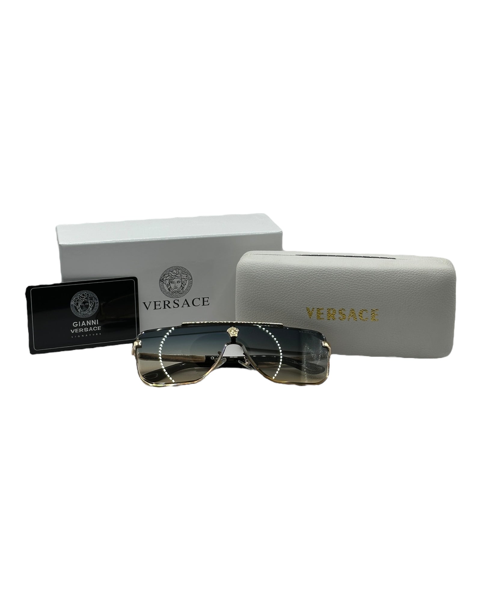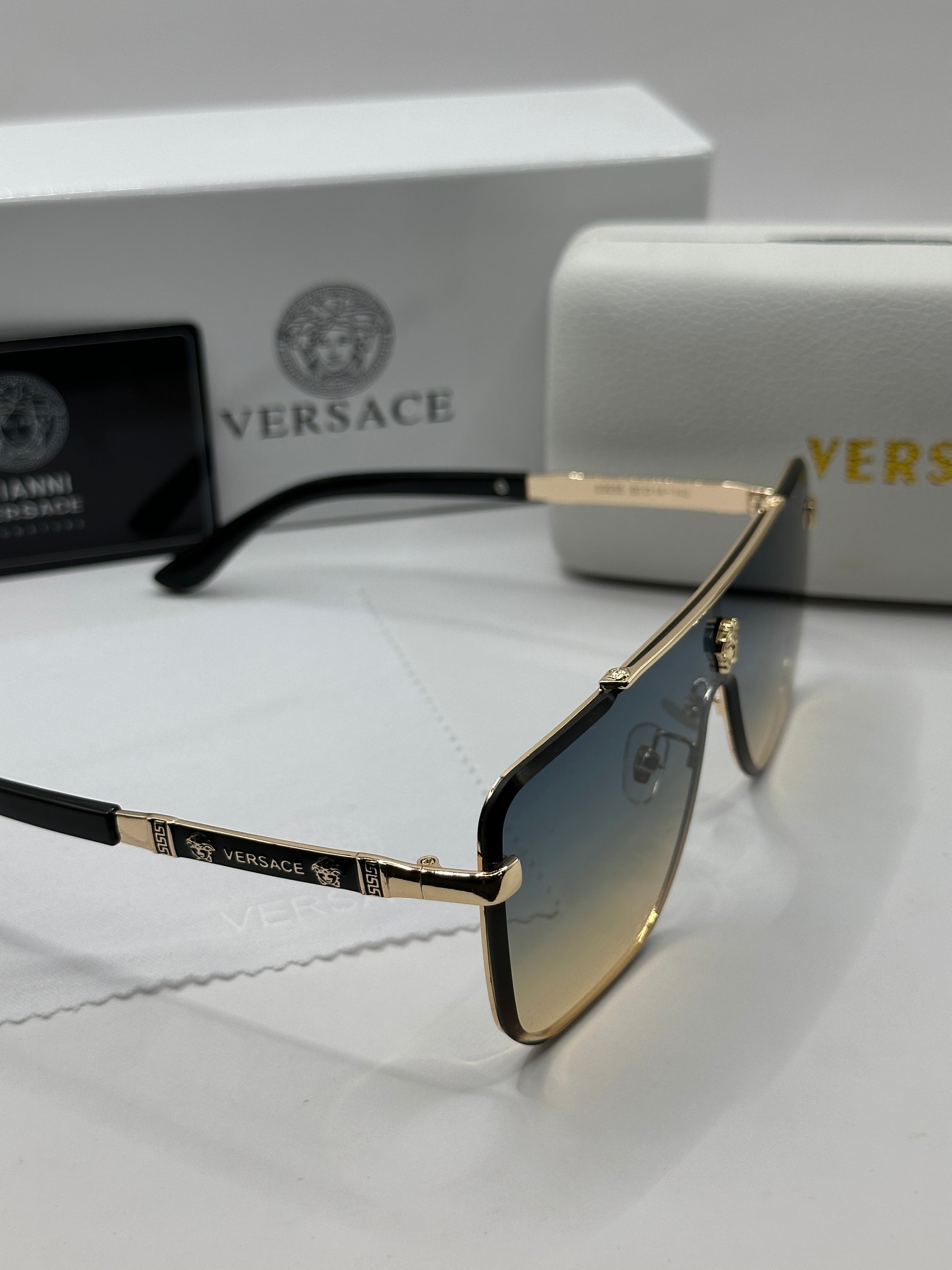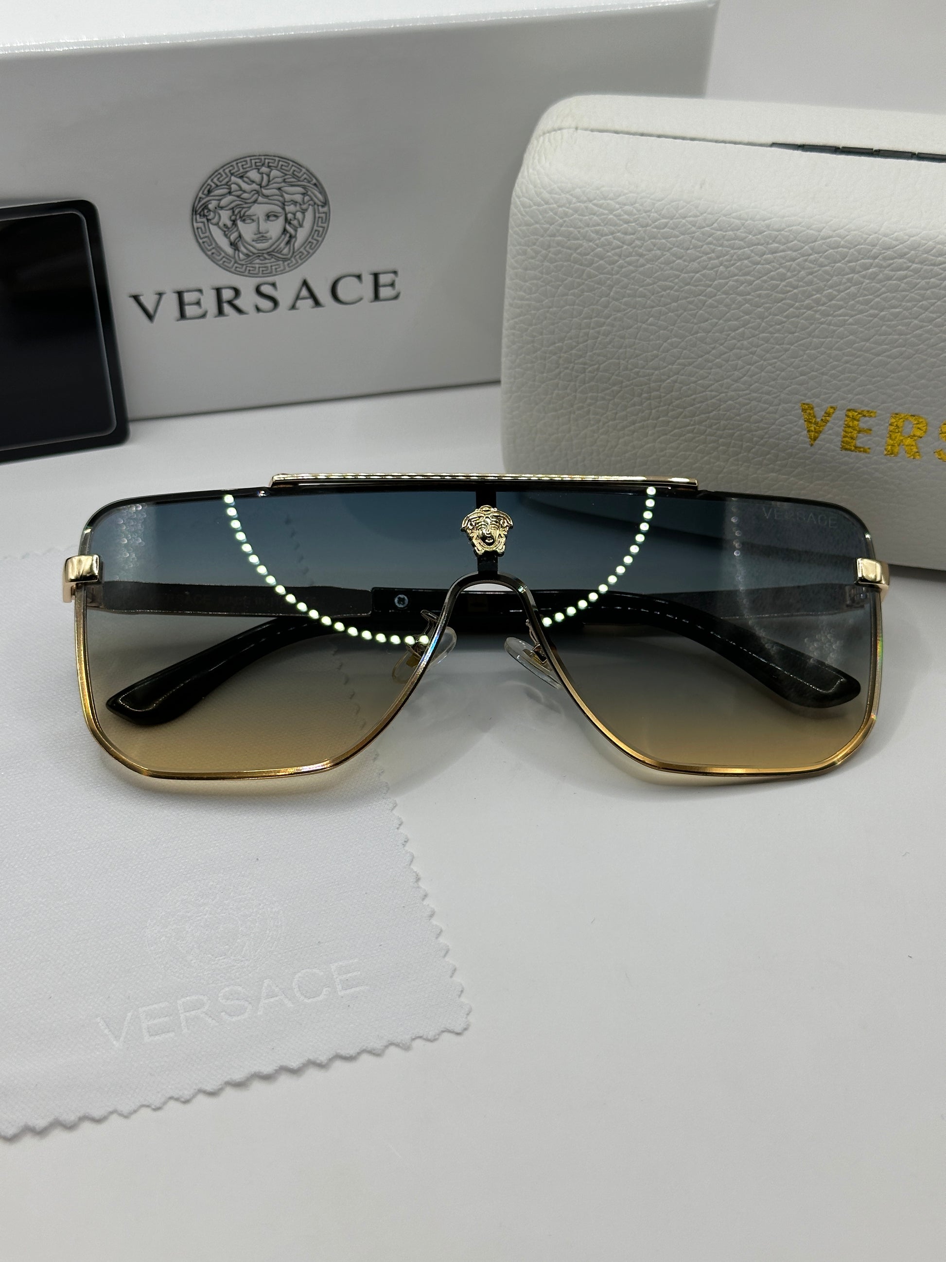 Luxuriöse Versace-Sonnenbrille. Das Set ist komplett und enthält das Etui, das Brillenputztuch, einen Schutzbeutel und die Box.