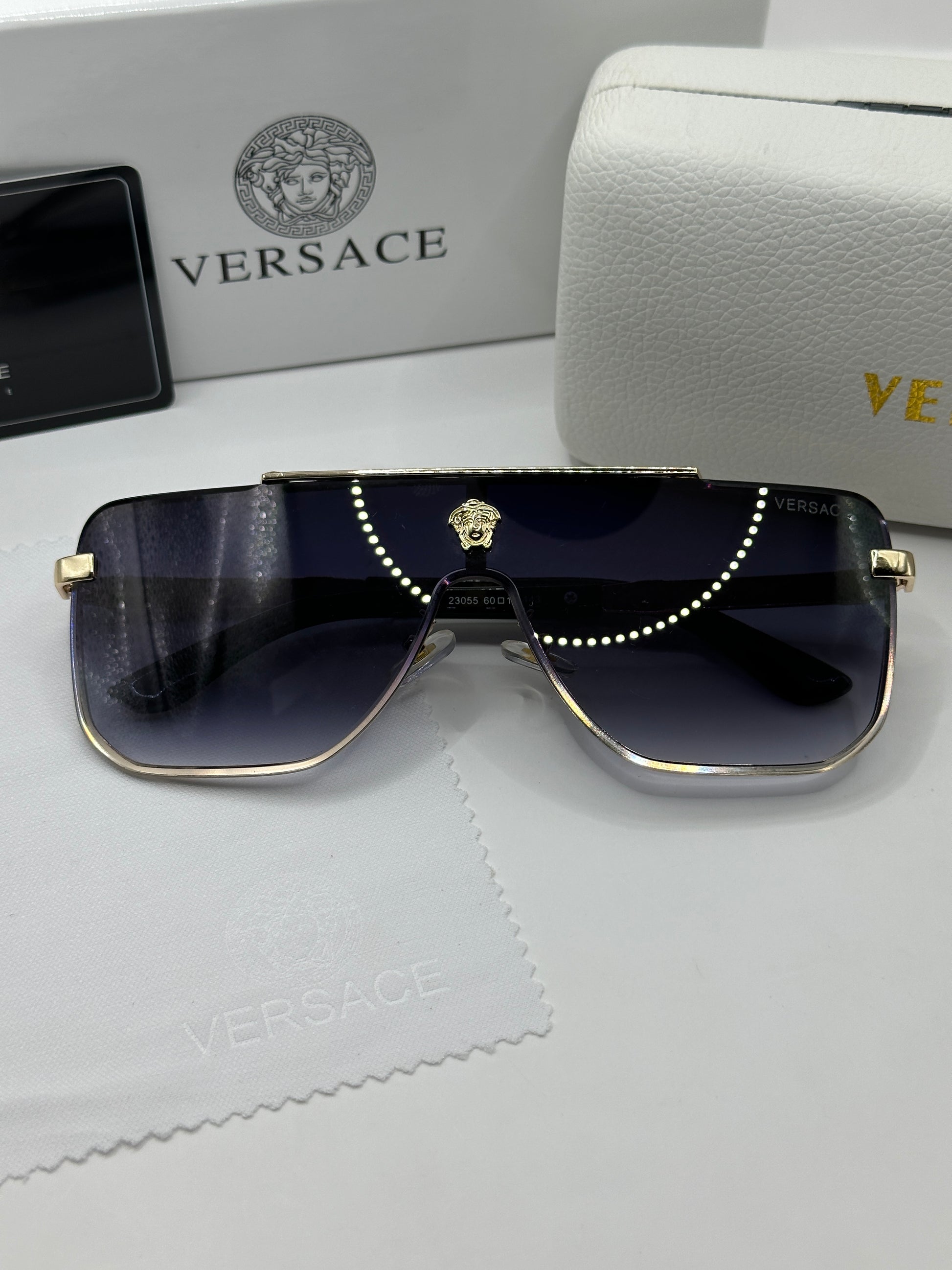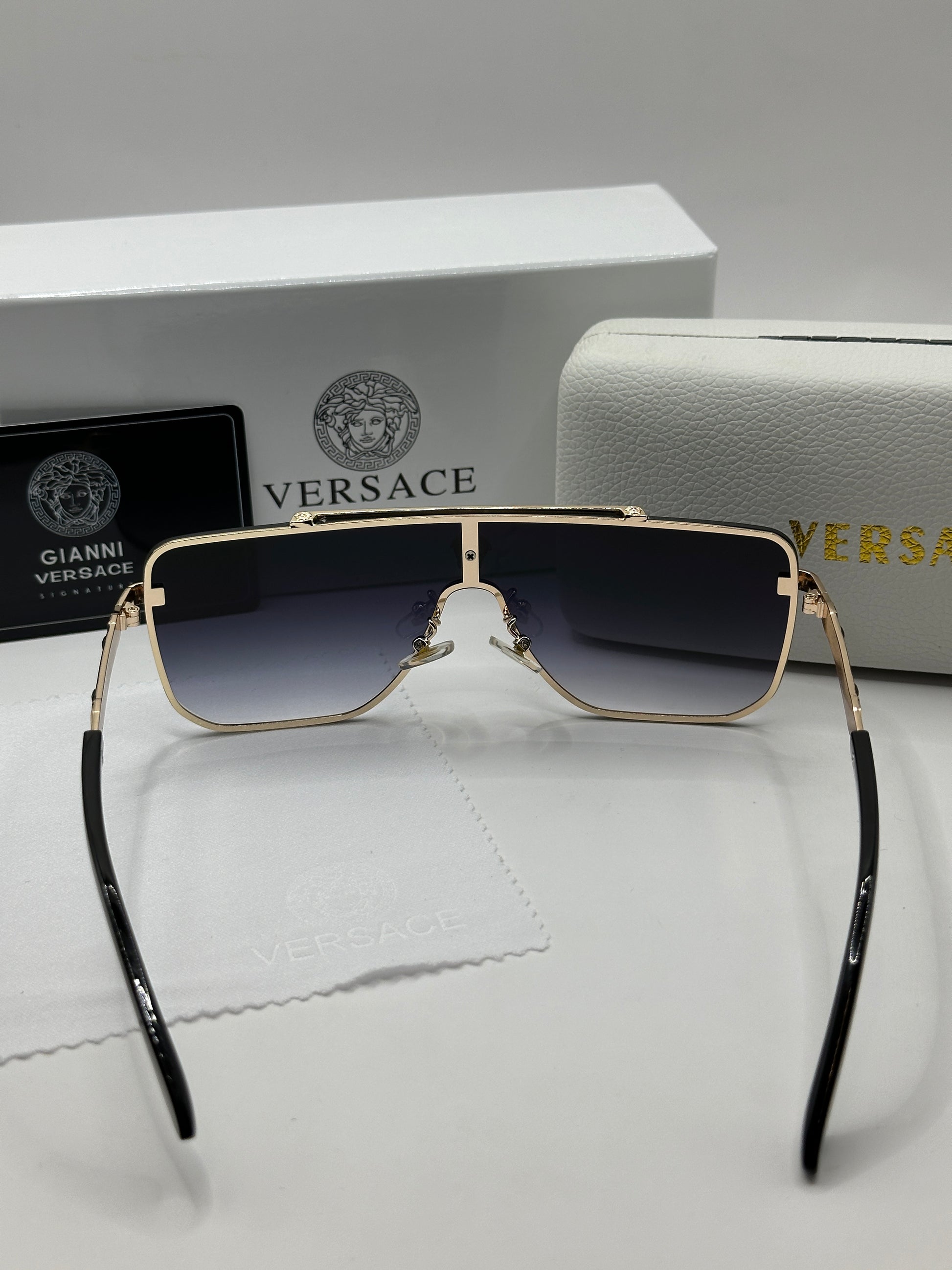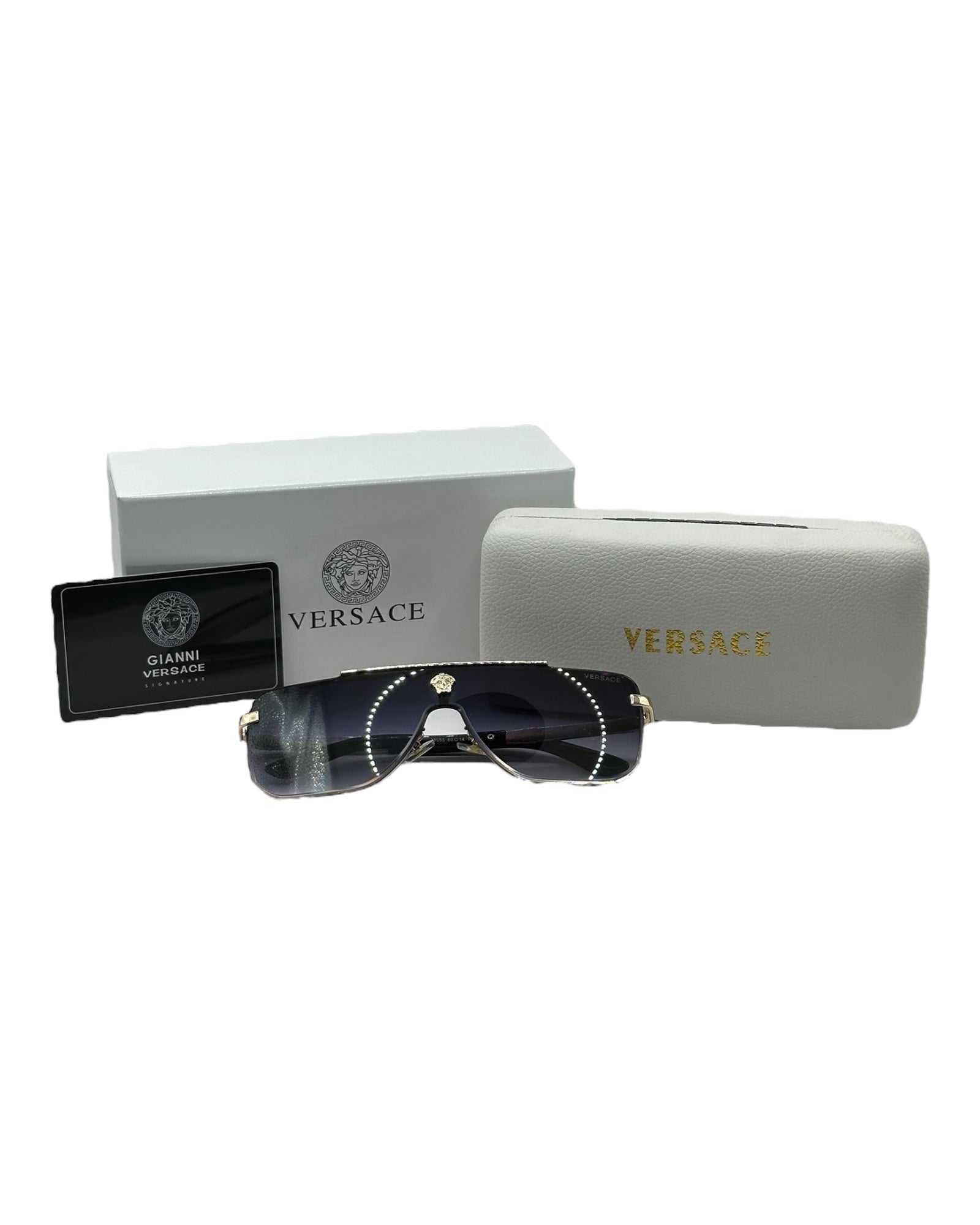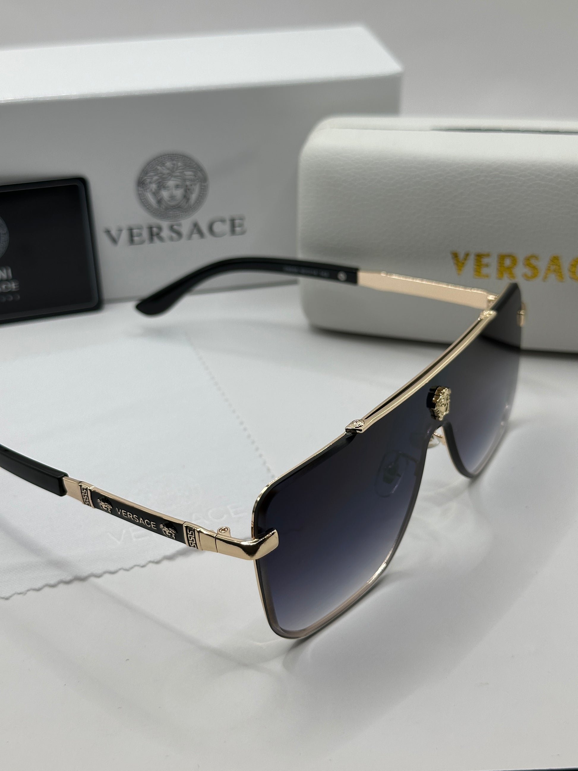 Luxuriöse Versace-Sonnenbrille. Das Set ist komplett und enthält das Etui, das Brillenputztuch, einen Schutzbeutel und die Box.